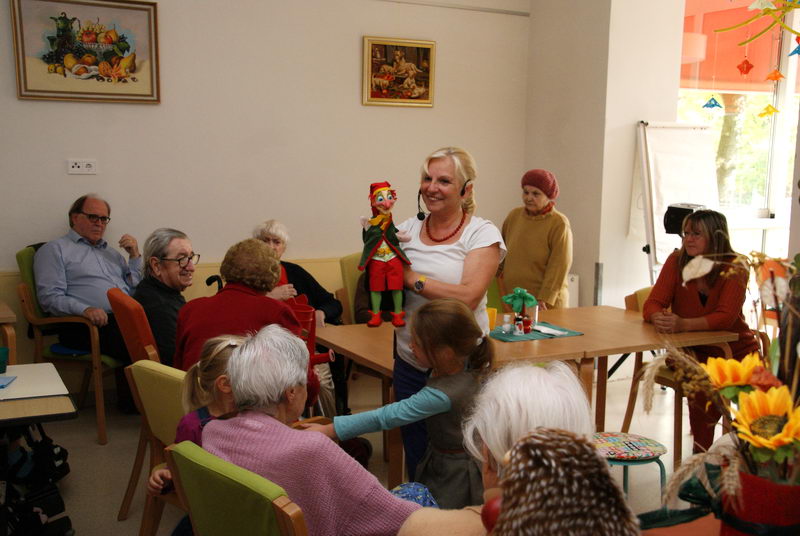 Nachdem das Schauspiel beendet ist und die Geschichte ein gutes Ende fand, kommt Ingeborg Authrid-Gruber hinter dem Vorhang hervor und der Kasperl gratuliert dem Ehrenkind.